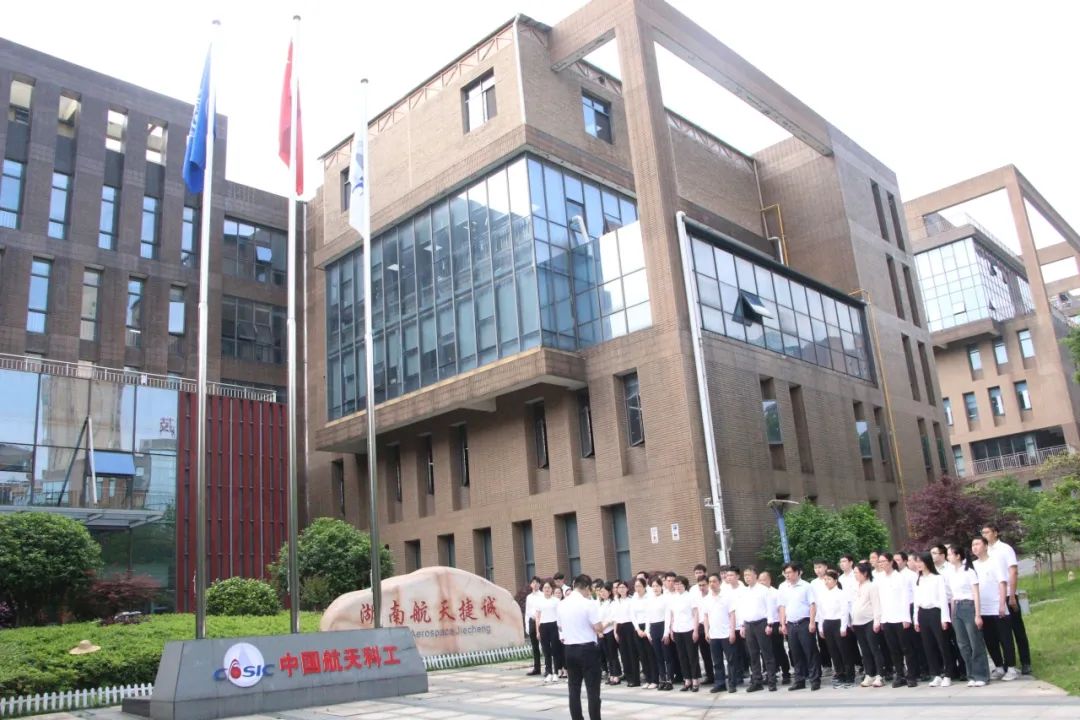 伴隨著雄壯的《義勇軍進行曲》響起,鮮艷的五星紅旗冉冉升起。隨著激昂的航天科工之歌,集團公司司旗迎風飄揚。在場全體人員肅然而立,行注目禮。